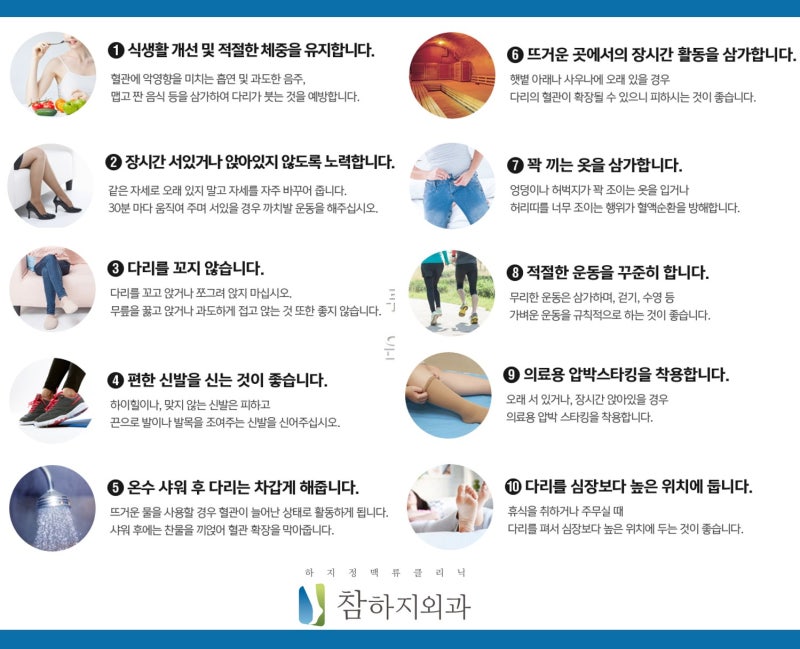 하지정맥류의 증상이 경미한 경우에는 하지정맥류 수술은 필요 없습니다. 약물치료, 의료용 압박스타킹 착용, 혈관경화주사와 같은 비수술적 치료로 치료가 가능한 부분도 있기 때문에 초기에 잘 대응하는 것이 중요합니다. 또한 하지정맥류 예방 및 좋은 습관을 통해서 하지정맥류 예방을 해주시기 바랍니다.하지정맥류의 증상이 경미한 경우에는 하지정맥류 수술은 필요 없습니다. 약물치료, 의료용 압박스타킹 착용, 혈관경화주사와 같은 비수술적 치료로 치료가 가능한 부분도 있기 때문에 초기에 잘 대응하는 것이 중요합니다. 또한 하지정맥류 예방 및 좋은 습관을 통해서 하지정맥류 예방을 해주시기 바랍니다.하지정맥류 예방 및 좋은 습관1. 장시간 앉아 있거나 서 있는 것은 피해주세요. 위와 같은 직업군을 가지고 있다면 같은 자세로 오래 서 있거나 앉지 말고 자주 자세를 바꿔 가볍게 걷거나 움직이는 것이 좋습니다. 2. 자주 다리를 들어올리면 발의 정맥혈이 심장을 향해 원활하게 흐를 수 있도록 도와줍니다. 수시로 발뒤꿈치를 들어올리는 스트레칭을 해주시면 다리 근육의 힘을 키워주고 근육이 정맥혈을 심장으로 잘 밀어올릴 수 있도록 해 혈류 개선과 하지정맥류 예방에 도움이 됩니다.3. 스트레칭 자주 해주세요. 다리를 구부렸다 폈다 발목을 돌릴 것, 누운 상태에서 다리를 들어 마치 자전거 타듯 돌리는 듯한 스트레칭을 수시로 하는 것이 좋습니다. 이런 가벼운 스트레칭도 다리의 혈액순환을 돕고 하지정맥류 예방에 효과적입니다. 4. 너무 뜨거운 곳에 노출되는 것을 피하세요.많은 분들이 뜨거운 물에 들어가거나 뜨거운 사우나에 가서 땀을 쭉 빼야 피로가 풀린다는 인식을 많이 가지고 있습니다. 하지정맥류 증상이 있는 분은 예외입니다. 오히려 다리 정맥이 확장되면서 다리 쪽에 혈액이 쌓이면서 부종이나 통증이 심해질 수 있습니다.5. 의료용 고탄력 압박 스타킹을 착용하십시오.의료용 압박스타킹은 허벅지부터 발목까지 압박 강도가 다르게 제작돼 하지 혈액순환을 돕고 다리 정맥의 혈액이 고이는 것을 방지해 다리 부종과 통증을 줄이는 효과가 있습니다. 또한 하지정맥류 치료나 수술 후 압박스타킹을 신으면 치료된 혈관 흡수를 도와 치료 효과를 높여줍니다.6. 복압을 올리는 행동에 의해 하지 정맥류가 발생할 수 있습니다. 변비에 걸리지 않도록 하는 것도 좋습니다.7. 허리띠를 너무 매는 행동이나 너무 조이는 옷을 입는 것은 정맥혈 순환에 장애를 일으킬 수 있으므로 피하는 것이 좋습니다. 8. 적정 체중을 유지하는 것이 좋습니다. 비만이나 체중이 많을 경우 다리 정맥 압력을 높이면서 하지 정맥류를 유발하거나 증상을 악화시킬 수 있기 때문에 적정 체중을 유지하는 것이 중요합니다.9. 임신 중에는 초기부터 의료용 압박 스타킹을 착용해 주시면 감사하겠습니다. 10. 비타민, 미네랄, 섬유질이 풍부한 채소와 과일을 섭취하십시오. 이것은 다리 정맥을 튼튼하게 합니다. 11. 기름지고 짠 음식 섭취는 피해주세요.12. 주무시거나 쉴 때 쿠션을 이용해서 다리를 높이 올려놓으세요. 13. 다리를 꼬고 앉는 습관은 피해주세요.14. 가족력이 있는 경우 증상이 조금이라도 나타나면 안양하지정맥류병원에 내원하여 정확한 검사를 받아 보시기 바랍니다. 부모님이 둘 다 하지정맥류가 있는 경우에는 아이의 약 90%에서 하지정맥류가 나타나게 되고 부모님 중 한 명만 하지정맥류가 있는 경우에는 아이에게서 약 45% 하지정맥류 발생 확률이 있습니다. 특히 하지정맥류는 남성보다 여성이 더 많이 발생하는 질환입니다. 하지정맥류 증상이 나타나면 신속히 안양하지정맥류병원에 내원하여 정확한 진단을 받으시기 바랍니다.하지정맥류의 좋은 습관과 예방법을 잘 숙지하여 예방 및 증상 완화에 효과를 내시기 바랍니다. 하지정맥류 관련 문의는 안양하지정맥류병원에서 상담하시기 바랍니다.하지정맥류의 좋은 습관과 예방법을 잘 숙지하여 예방 및 증상 완화에 효과를 내시기 바랍니다. 하지정맥류 관련 문의는 안양하지정맥류병원에서 상담하시기 바랍니다.하지정맥류의 좋은 습관과 예방법을 잘 숙지하여 예방 및 증상 완화에 효과를 내시기 바랍니다. 하지정맥류 관련 문의는 안양하지정맥류병원에서 상담하시기 바랍니다.