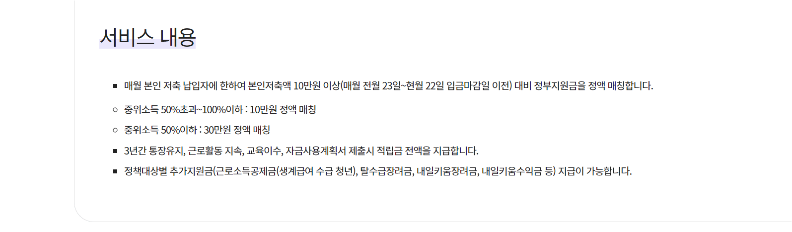 정부는 저축액이 월 10만원 이상인지 여부에 따라 월 최대 30만원까지 지원한다.